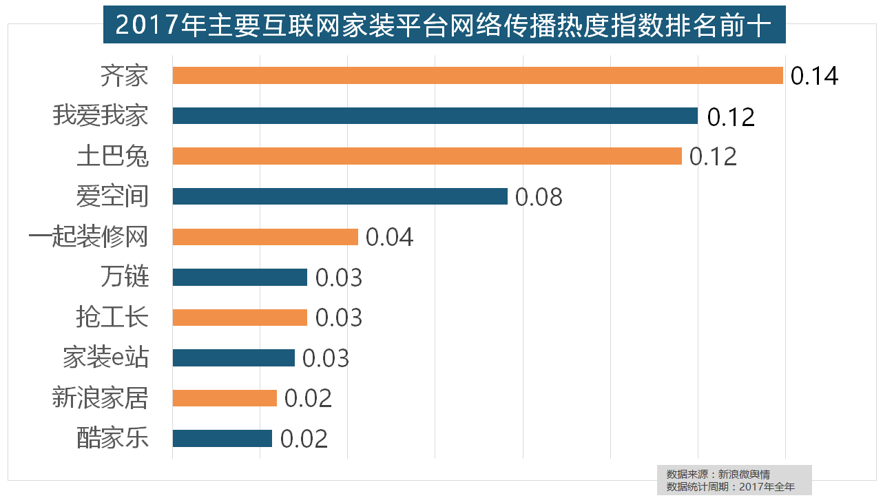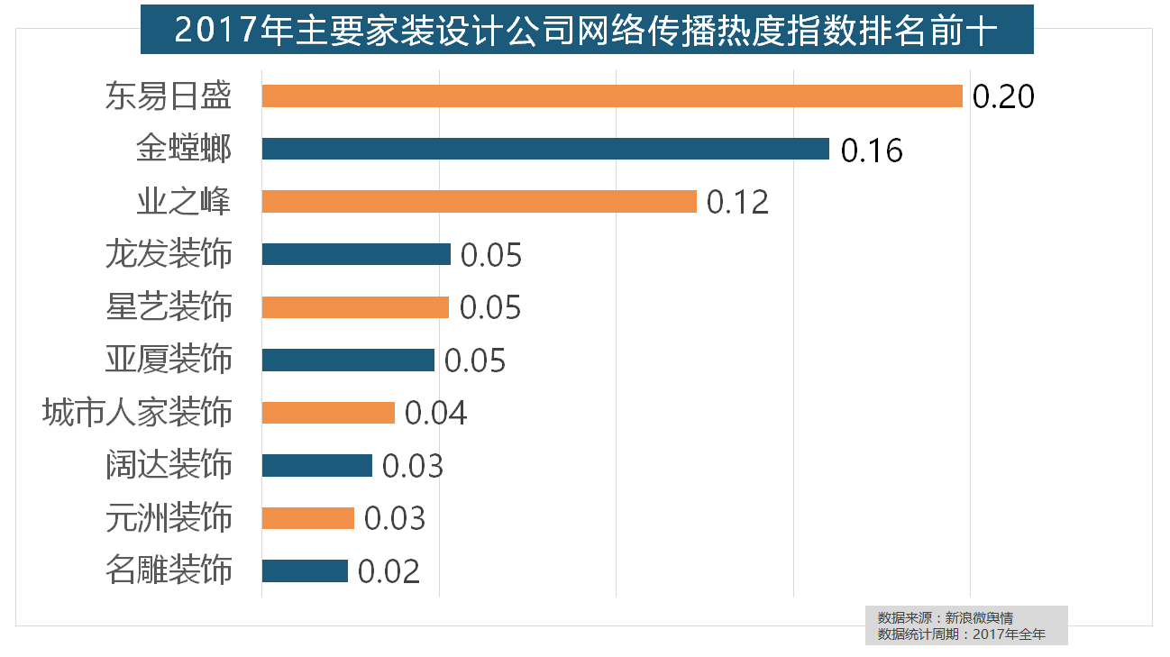 正在次要家拆产物类别热度方面,一批具有必然规模的家拆设想公司也纷纷出现。2017年,我们遴选了跨越500个品牌进行数据统计取阐发,恒洁卫浴、乐家卫浴、美标卫浴、安华卫浴、法恩莎卫浴位列六至十位。“拆修”的收集热度指数为29.89,2017年,东易日盛正在过去的一年中收集热度指数最高,随后为卫浴类和地板类产物。据新浪微舆情大数据阐发显示,柔然壁纸、玛堡壁纸、布鲁斯特墙纸全年热度相当,虽然近年来浩繁互联网家拆平台纷纷兴起,排名第六!